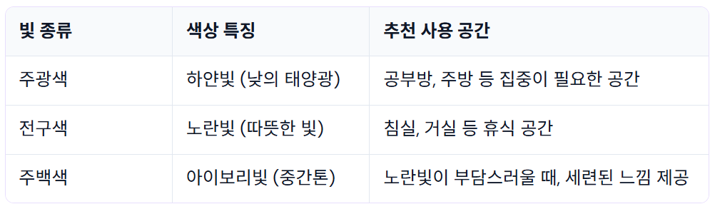 전구색(노란빛): 카페나 호텔 로비 같은 따뜻한 빛입니다. 휴식이 필요한 침실과 거실에 필수입니다.