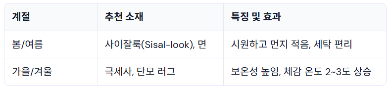 러그는 계절에 맞춰 소재(여름: 사이잘룩, 겨울: 단모)를 달리하되, 색상은 단색으로 통일하세요.